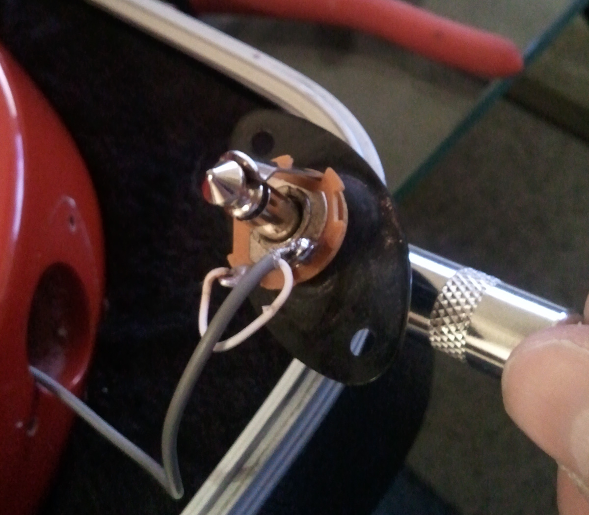 j'ai un problème de soudure sur la sortie Jack de ma gratte... En effet, je jouais et d'un coup, plus de son (et faut dire que le boulon était desserré, donc le jack bougeait pas mal dedans au moment où ça a lâché)...