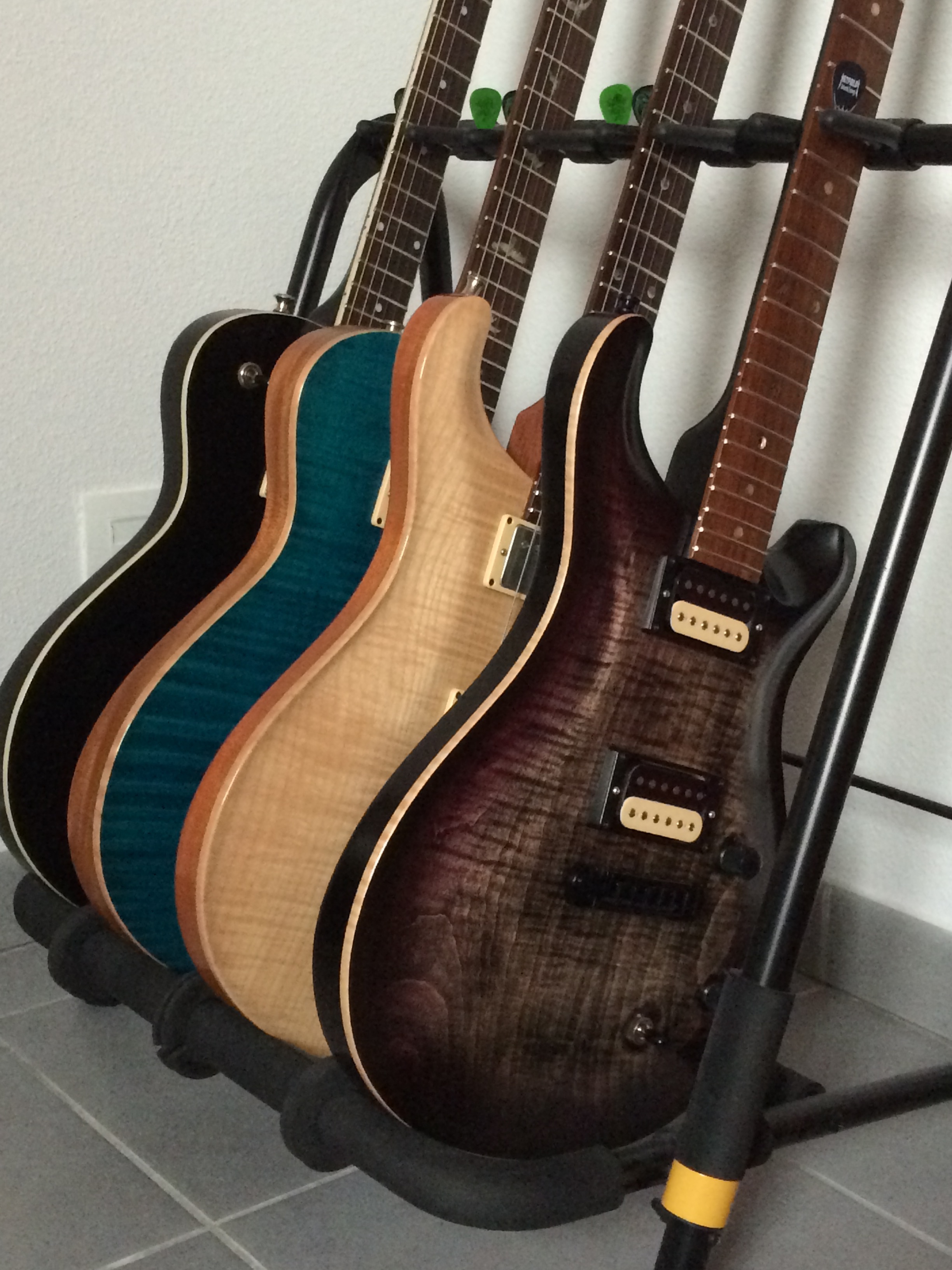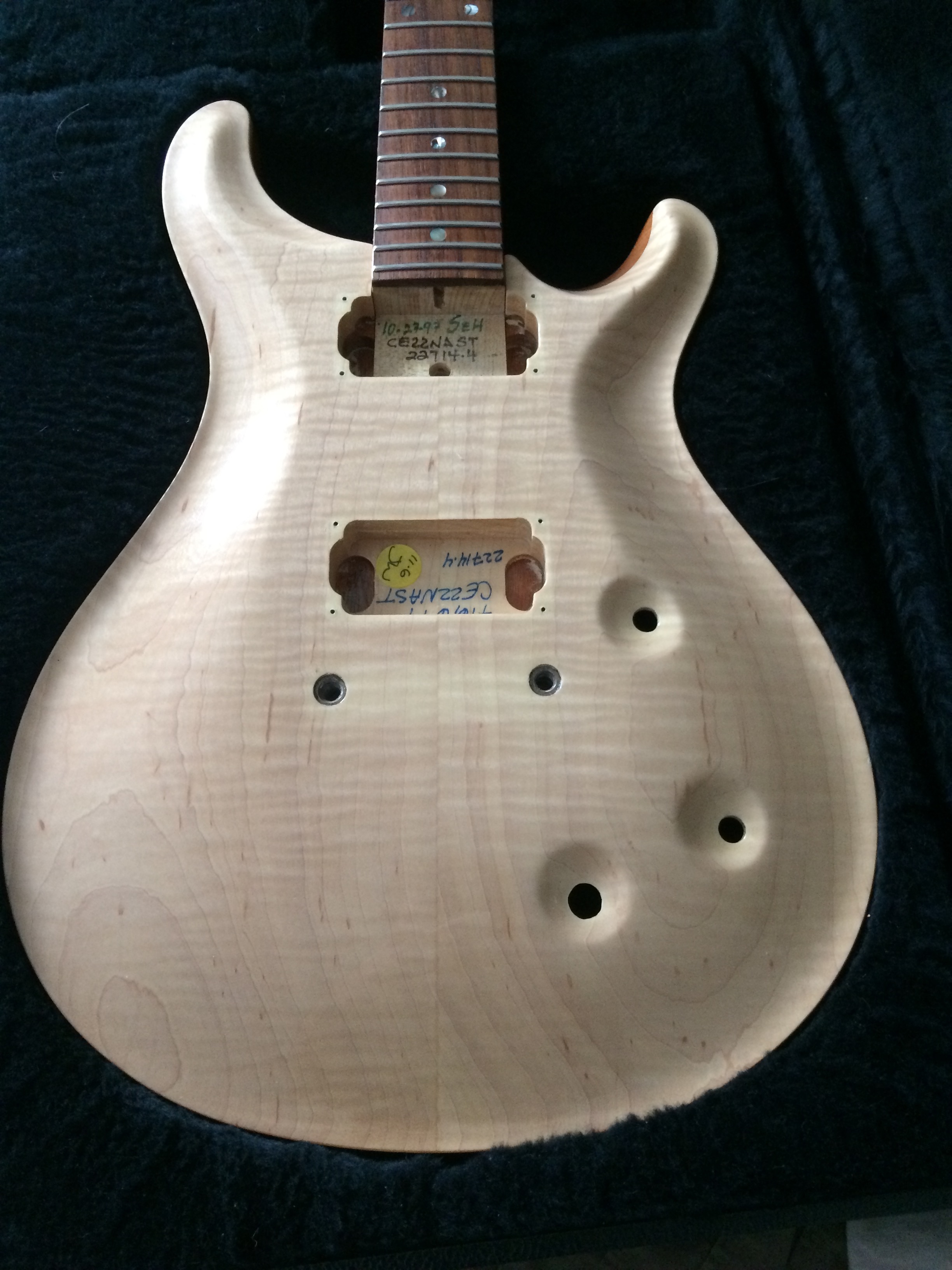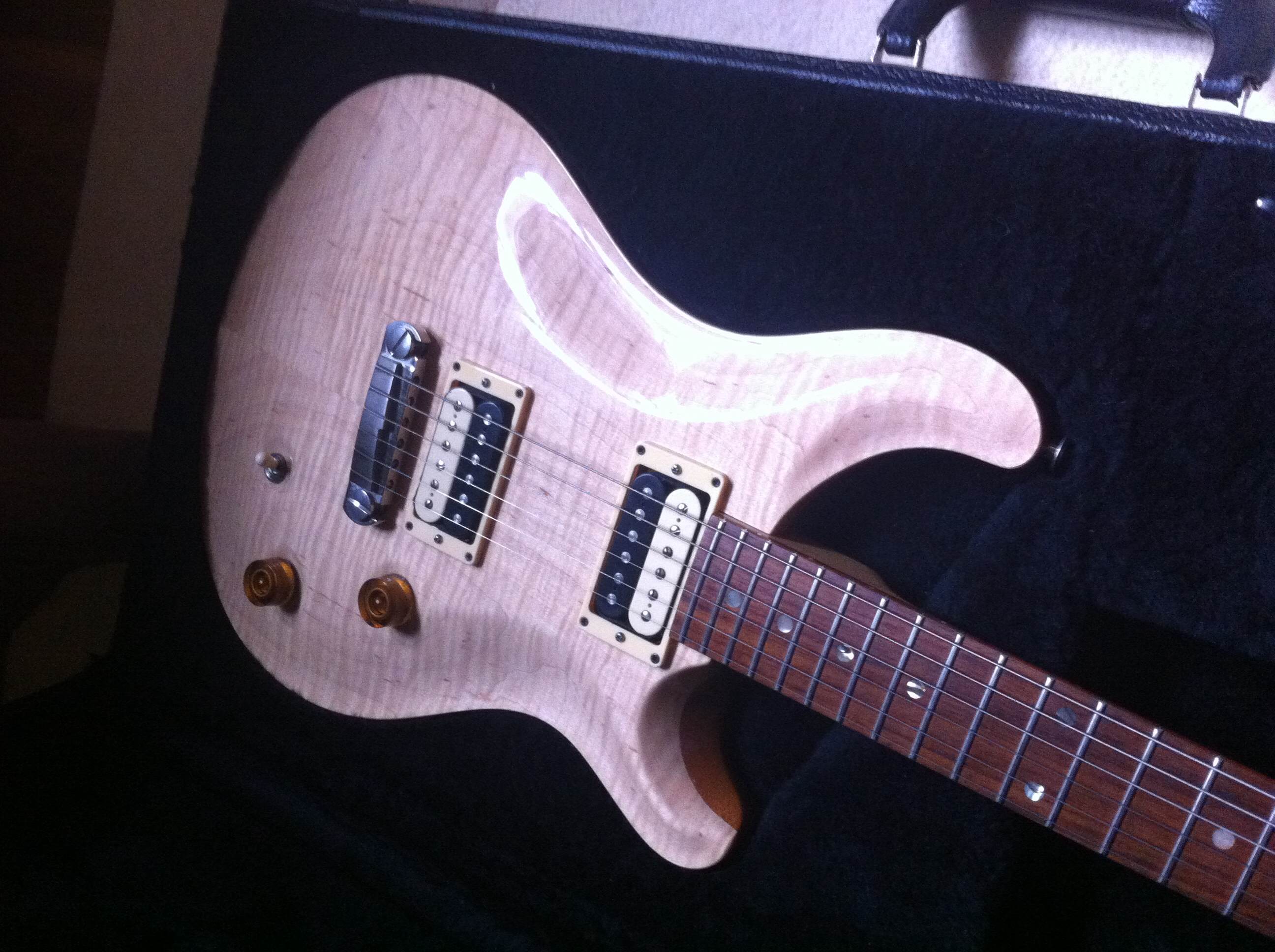 Je viens de recevoir la guitare avec son nouveau finish, ainsi qu’une partie du hardware. Il me manque l’elec, mais je n’ai pas pu m’empecher de la remonter pour voir ce que ça donne; voici donc le résultat,