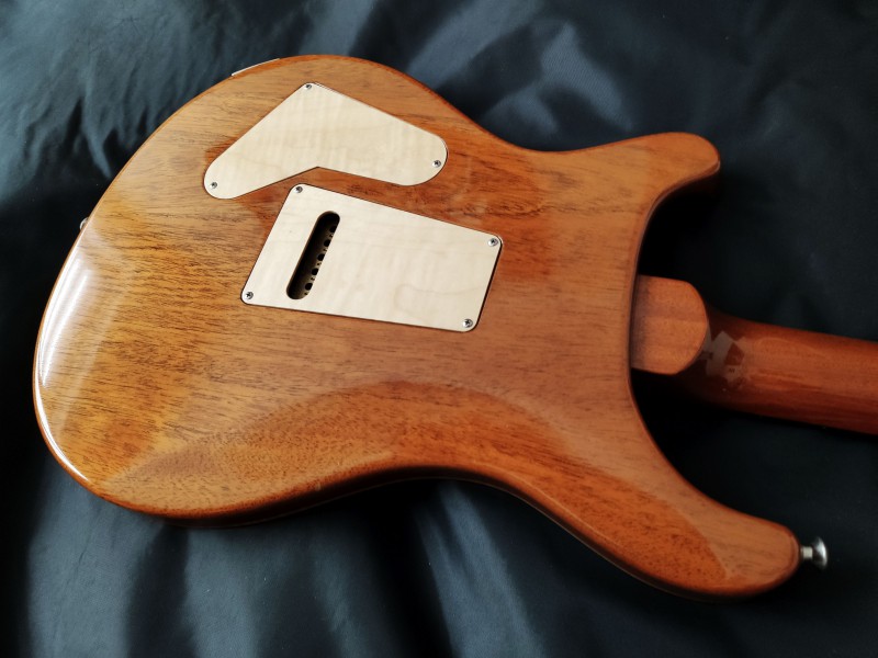 Comme on le voit, il y'a eu des modifications: les contours micros et plaques arrières sont en érable flammé du plus bel effet, les boutons et switch top sont maintenant des "baltic sea" - jusque là ça me va très bien