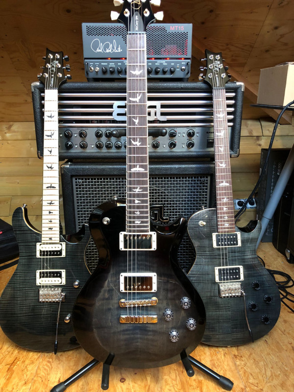 Niveau son on est dans du PRS pur jus : ça n'est ni une LP ni une strat mais bien l'entre-deux monde. Ca envoie quand il faut, c'est épais et très défini. Là elle est assez bright, il faut que je règle un peu les micros pour qu'elle sonne comme je veux.