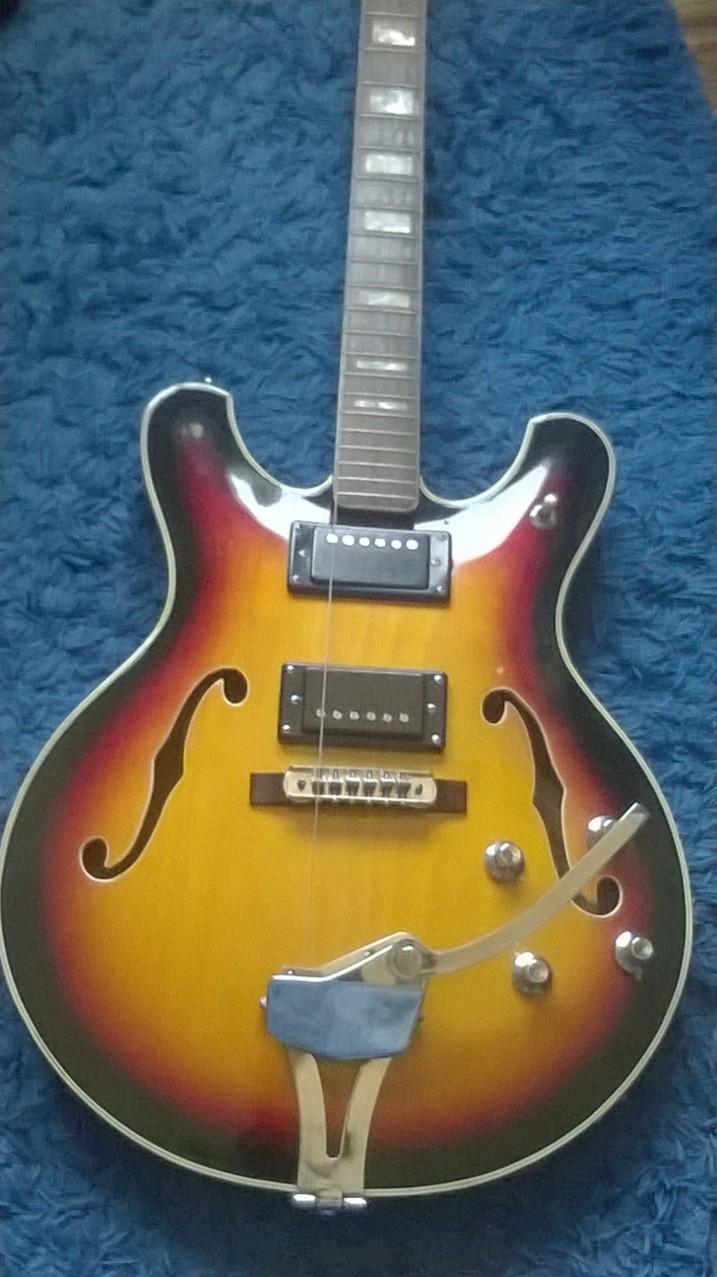 - j'ai un peu cherché dans les "usual suspects" (Eko, framus ... ) sans rien trouver; à mon avis, il faut se baser sur la forme des cornes qui est originale et pourrait amener la réponse