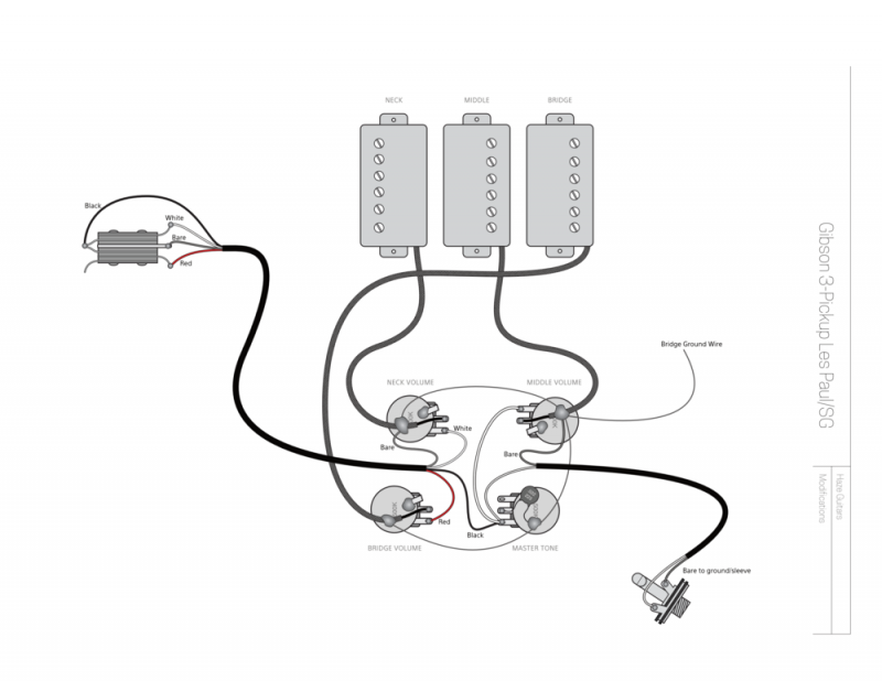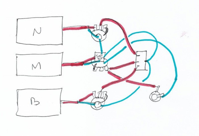 Mon idée est d'appliquer ce que je fais sur ma strato : les micro manche et chevalet sont connectés à un sélecteur 3 positions et le micro du milieu arrive derrière le stelecteur en blender, sur un potar push/pull (hors phase).