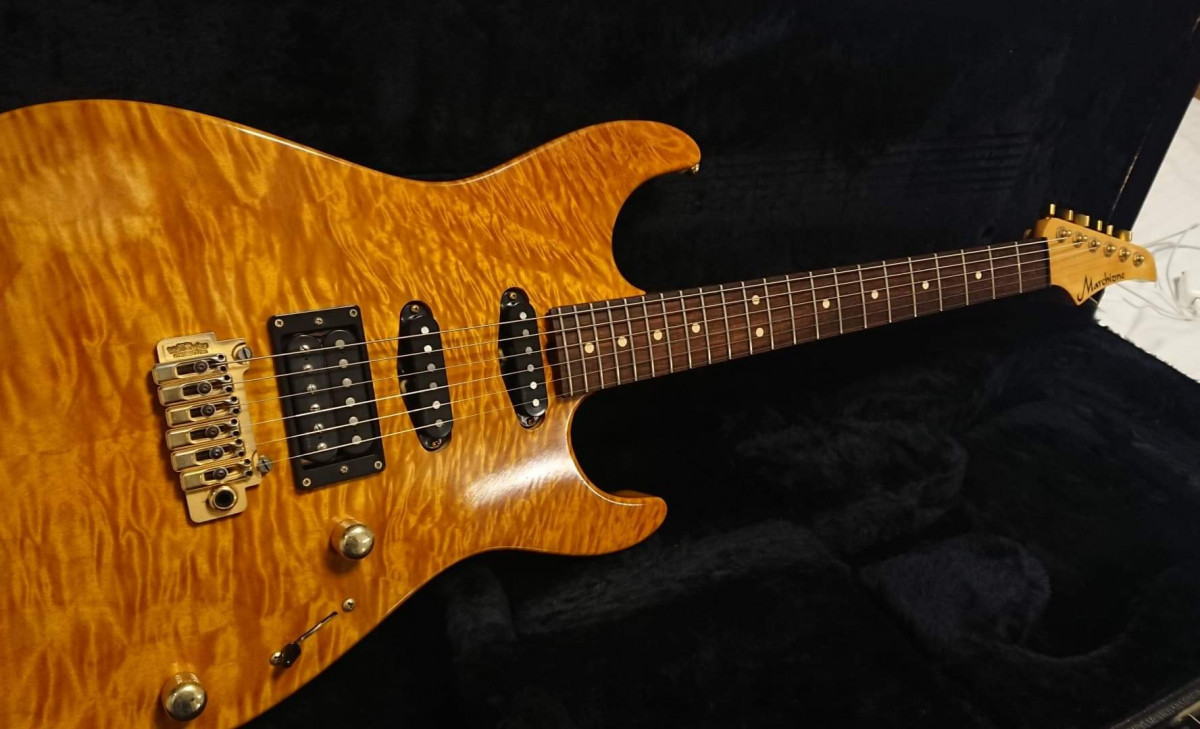 - une superstrat de Stephen Marchione, corps 2 pièces swamp ash et une table figuré (mais c'est pas de l'érable, il me semble que c'est un type de "spruce" utilisé en acoustique et jazzbox, parfois il en fait des corps une pièce massif) 2,7kg sur la balance, en HSS, vibrato Wilkinson VS100 bloc acier et mécaniques Sperzel bloquantes ( pas l'accastillage le plus léger)