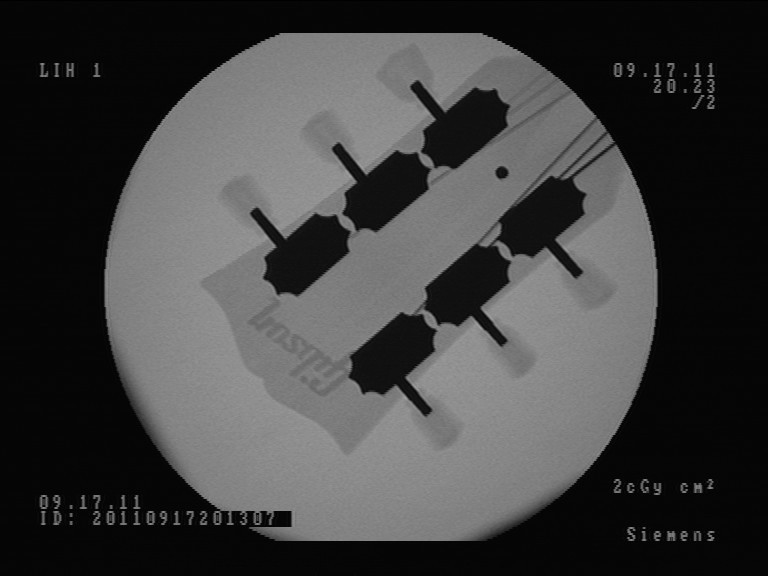 Impossible de savoir réellement mais normalement les slash (et la vermillon en fait partie) sont weight relief. C'est a dire que gibson fait 9 trous dans le corps pour alléger la guitare. C'est une technique que gibson a utilisé sur ses standard de 82/83 a 2007. J'ai radiographié ma gibson AFD est tu peut voir a quoi ça ressemble là