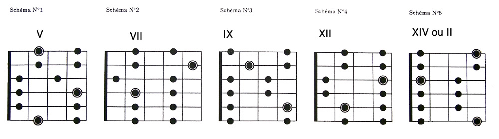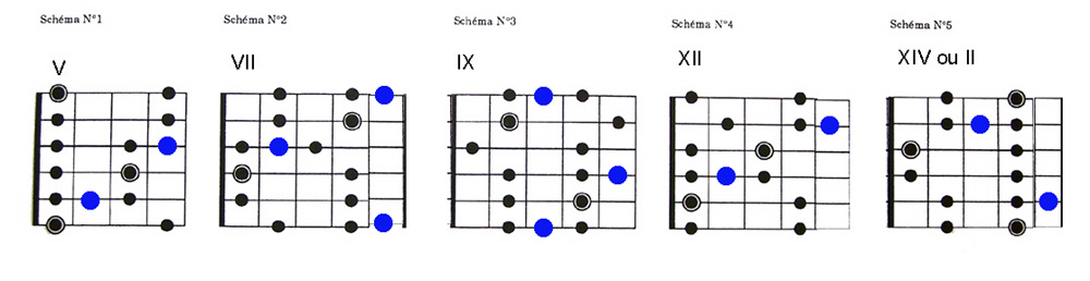 en ce qui concerne les positions, faut les voir comme quelques notes prises dans une gamme et placées sur le manche de facon pratique