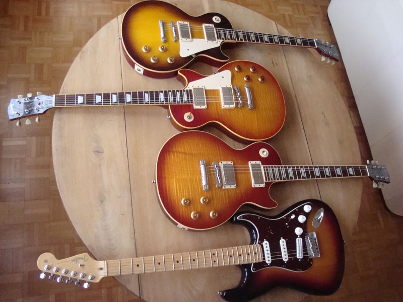 Voilà et pis une photo de famille avec les CS et ses 2 sœurs : un LP standard de 2003 manche 60’s et une Fender American strat de 2004 (avec un humbucker en bridge sinon je suis perdu juste avec des simples !)