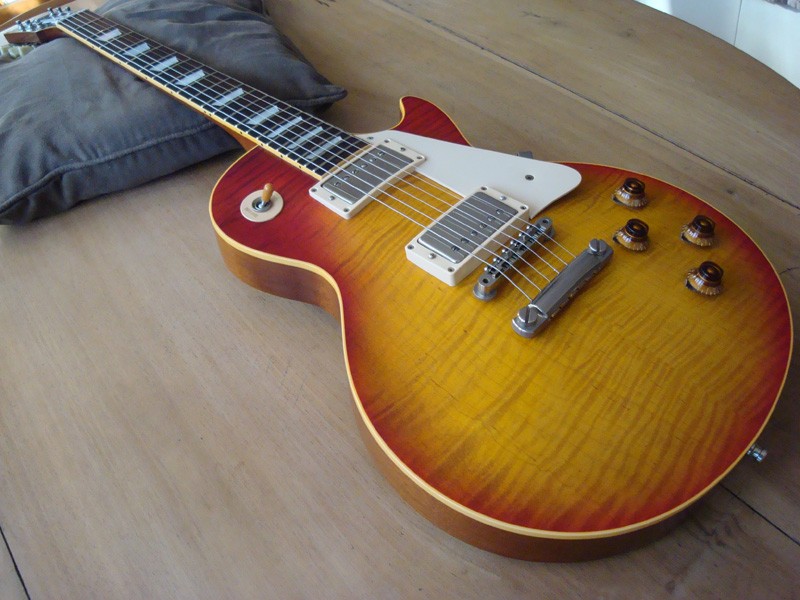 La petite dernière, ma R9 de 2001, monté en Voodoo59 pour le bridge et en classic 57 pour le neck. Les micros Wizz en alnico4 sont en cours d’expédition. Les inlays, les knobs, le montage des mécaniques sur la tête ne sont pas vintage correct me direz-vous mais qu'importe c'est une pelle qui me plait. la table grade A en Heritage Cherry Sunburst et les mineral fleks lui donnent un sacré charme, sont poids 3.8kg (mon dos lui dit merci), la guitare est très résonnante et bien équilibré. J'adore le vernis du dos qui a viré, bien "fade" et selon les angles de vue est un peu plus rouge, sous les caches en plastique c'est encore rouge vif. C'est une player, donc des dongs un peu partout, un bon relicage naturel en fait.