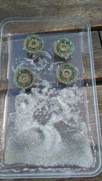 En fait, ce qu'il faut faire, ça m'est revenu en re-faisant le truc, c'est de ne pas laisser tremper. Sinon pas d'oxydation. Il faut passer les knobs dans la tambouille, bien vérifier qu'il y ait des cristaux de sel et laisser sécher un peu. Et recommencer X fois jusqu'à obtention du résultat voulu. Moi je ne voulais pas un résultat trop prononcé, donc j'ai pas insisté. Mais pour arriver à ce que boudibouda à GASé, je pense qu'il faut renouveler un paquet de fois sur plusieurs jours. Parce que l'oxydation se fait par l'intérieur du knob, le temps que ça arrive côté plastique, il faut que ça oxyde la peinture dans son épaisseur. On le voit sur ces clichés.