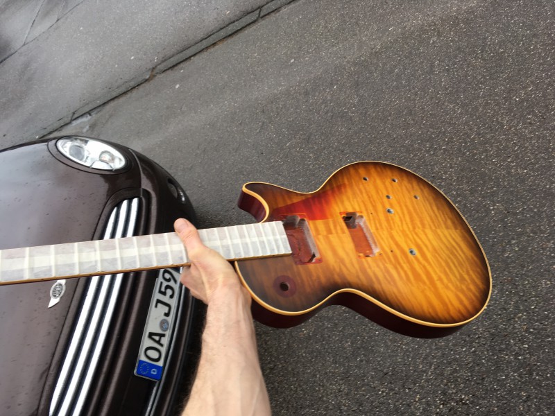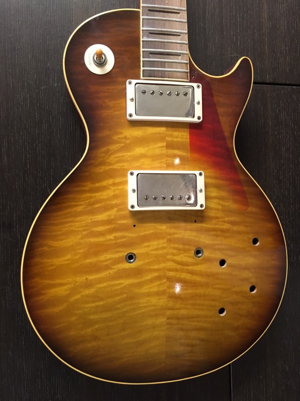 Je n'ai pas regardé en détails, mais mon oeil de noob remarque qu'entre la copie et l'originale, la transition de teinte autour de l'emplacement du pickguard est beaucoup plus floue sur l'originale, alors que sur la BM (BMO ? ) la séparation entre les deux teintes est beaucoup plus nette.