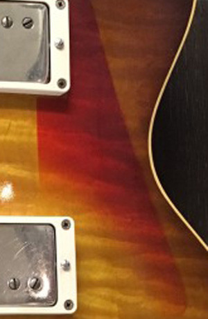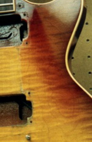 Il fait le fading avec le pickguard posé. Ce qui correspond au process réel (à une vitesse plus élevée). Et après c'est les premières semaines de vie de la guitare qui font le reste.