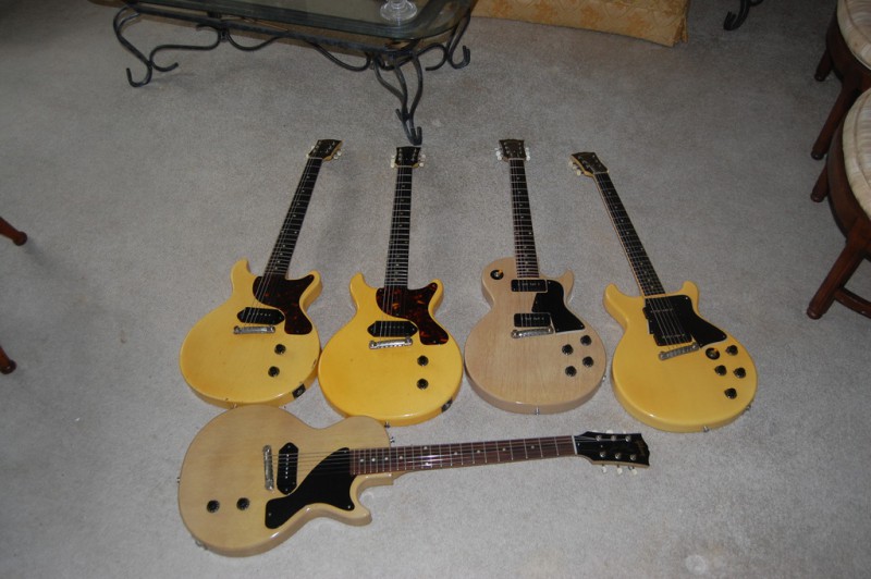 Il y a plusieurs périodes de TV yellow avec des nuances de teintes entre 1954 et 1960. Toutes ne sont pas jaunes. Beaucoup étaient en sortie d'usine 'limed mahogany" (nom donné dans les catalogues Gibson), certaines "wheat" (le nitro faisant tourner le tout vers l'orangé) dans les premières années et "banana" (très clair, presque blanc) à la fin en 1960/61. Au fur et a mesure des années, on voit de moins en moins le grain du bois, la peinture étant de plus en plus opaque.