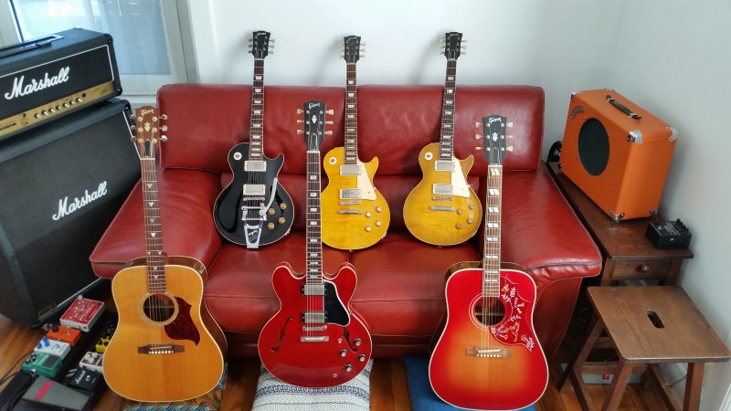 LP R0 ebony (upgrade mics Arcane et Bigsby), LP 59 replica Baranet, LP 59 replica relic Bartlett (2 répliques qui sonnent mieux que toutes les Rx que j'ai joué chez Gibson)