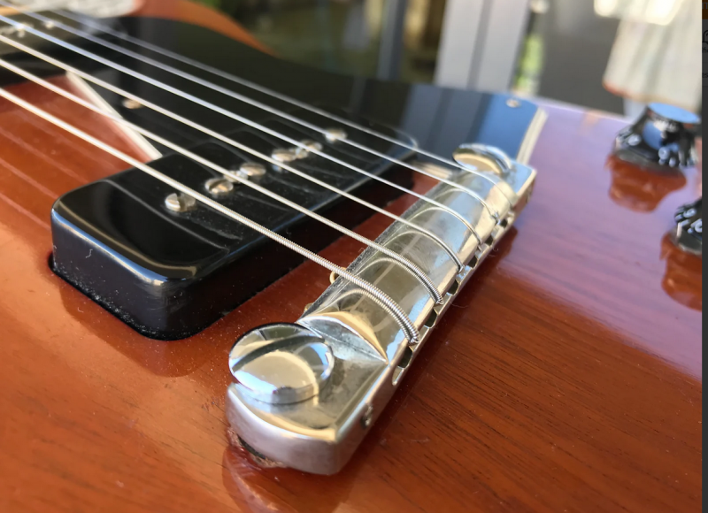 On dirait qu'il manque les vis de réglage d'intonation et qu'on a trituré les trous pour les inserts.