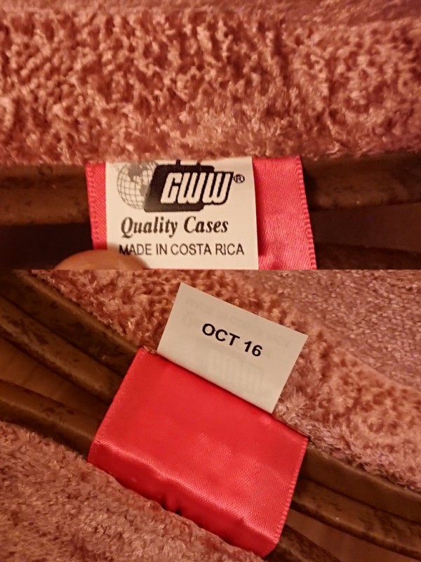It's one of the very rare ReIssue cases that were Made In Costa Rica. As you can see, the case is much more " period correct " than the newer style of Lifton ReIssue cases. The case features a brown tolex exterior with a more accurate colored plush, pure pink interior, a single neck block ( neck rest or cradle ) and smaller latches than the newer Lifton ReIssue cases. These are all the same characteristics, found on the original vintage genuine Lifton cases that were made in the 1950's.