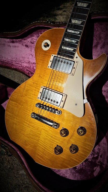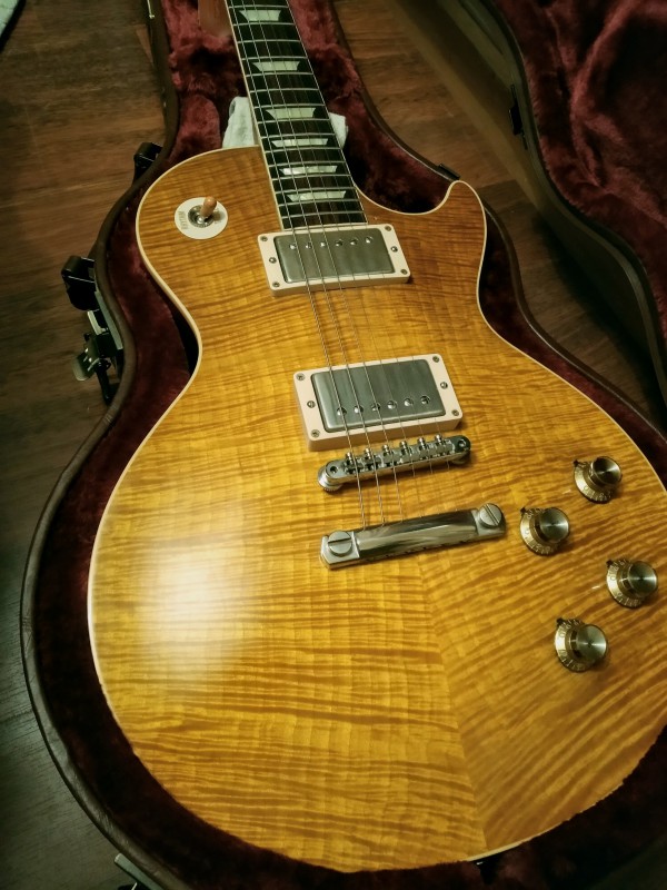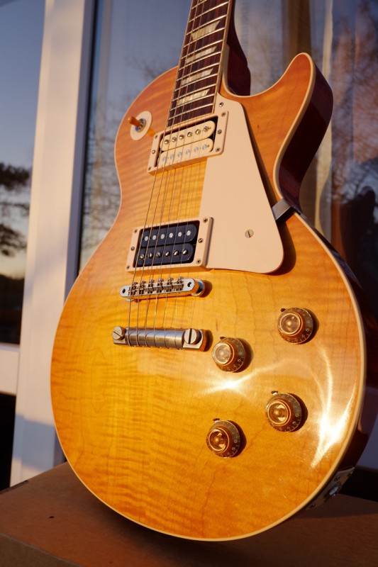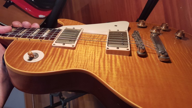 Tiens, en voyant ma LP comme ça, ça me rappelle que le rouge du manche est sacrément remonté sur le binding. Ce n'était pas comme ça d'origine, ça a évolué avec le temps, par endroit le binding est presque rouge. Allez, on va dire orange.