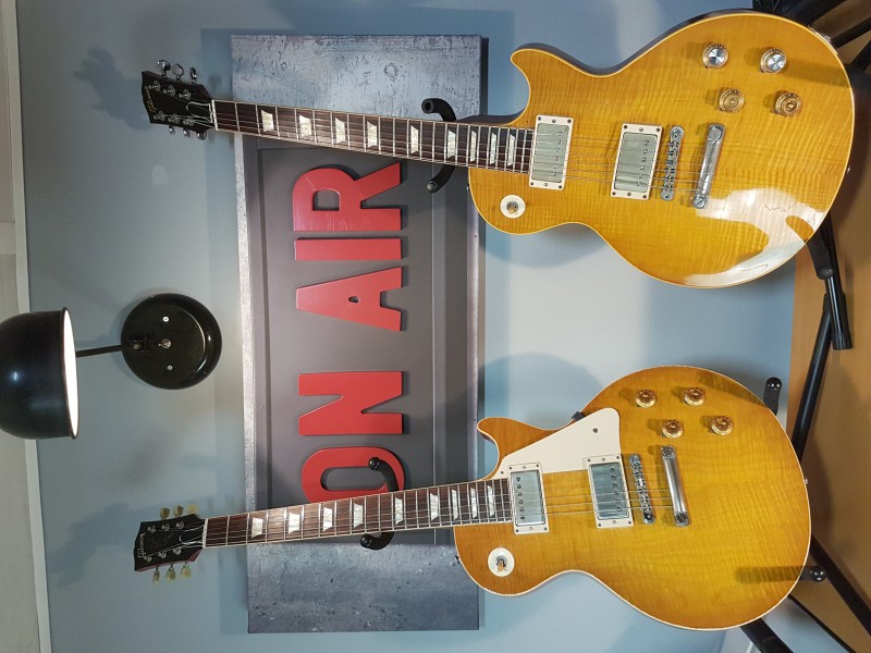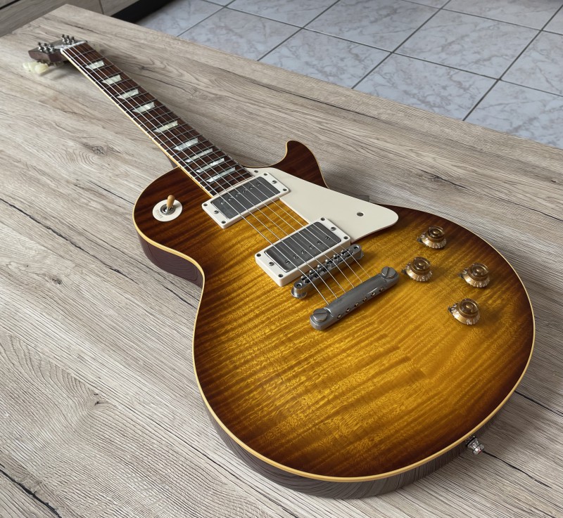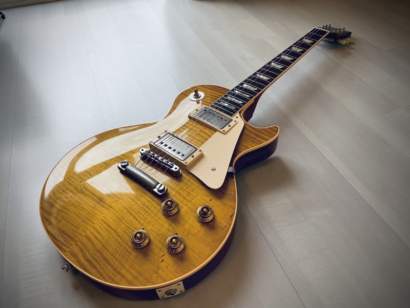 Tiens, en voyant ma LP comme ça, ça me rappelle que le rouge du manche est sacrément remonté sur le binding. Ce n'était pas comme ça d'origine, ça a évolué avec le temps, par endroit le binding est presque rouge. Allez, on va dire orange.