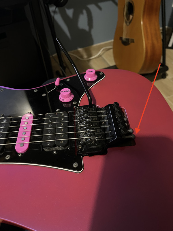 Lorsque que je l'ai récupérée, j'ai remarqué une fois chez moi que la vis (dont je ne connais pas le nom, désolé) qui sert à bloquer la base de la corde de Mi grave, dépassait énormément, ce qui me bloquait l'utilisation du floyd.