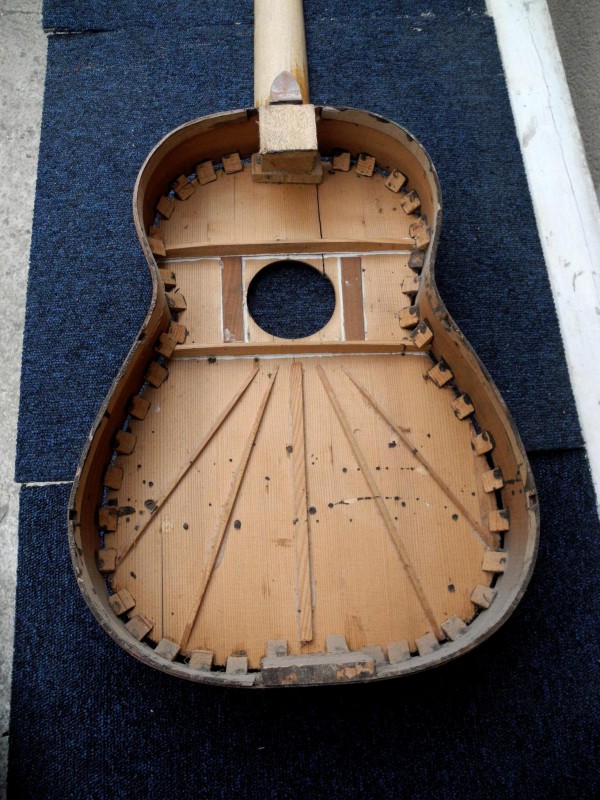 Voilà, j'essaye de trouver des infos sur une guitare classique en très mauvaise état et visiblement ancienne que j'ai achetée à un brocanteur il y a quelques temps et que je suis en train de retaper.