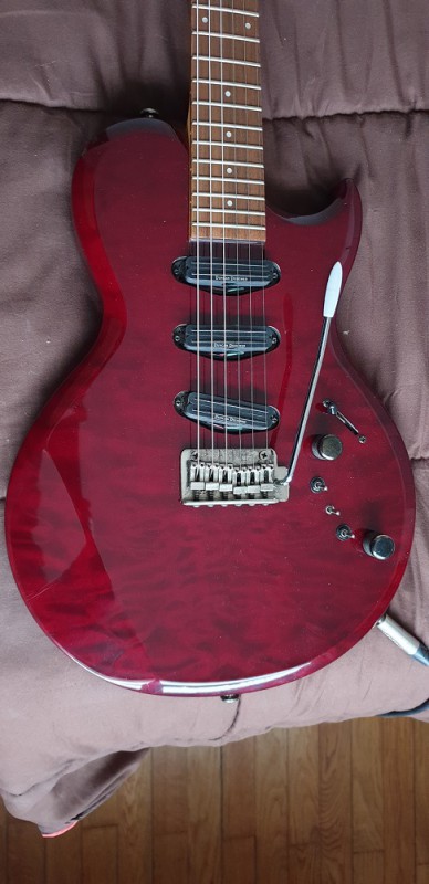Elle a la forme Lp avec 3 micros de format simple bobinage, 2 potentiomètres, i sélecteur 5 positions et 3 petits interrupteurs. Merci pour votre aide