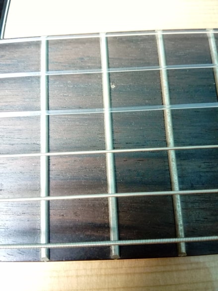 En profiter pour nettoyer la touche après tout ce temps. Un petit coup de Fast-Fret (ou d'huile de citron, qui n'a rien à voir avec le citron) devrait faire l'affaire. Produits toxiques à manipuler avec précaution ET parcimonie, mais le bois de la touche appréciera et les frettes aussi...