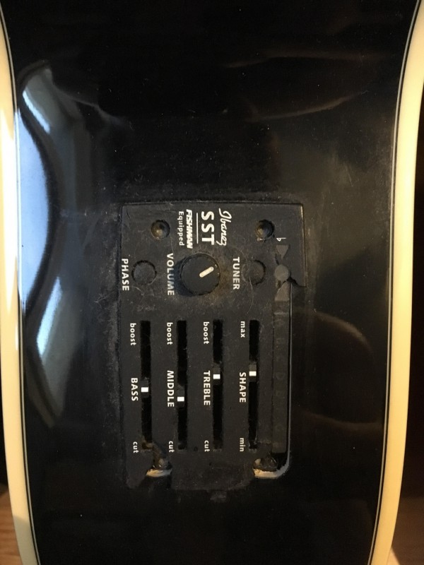 je sollicite votre aide ce soir pour quelques conseils de réparation. En effet, j'ai depuis peu pu remettre la main sur ma guitare électro acoustique, une Ibanez AEL20E-TKS. Cependant à ma grande stupeur, outre la poussière, je me rends compte qu'elle a souffert bien que n'ayant pas été jouée depuis un moment.