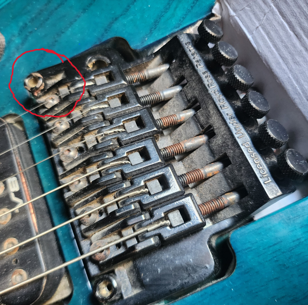 en effet en nettoyant des traces degueulaces a l alcool 70 du corps je m aperçoit que le floyd etait pas a la bonne place du coté des aigus , la guillautine etait posée sur le pas de vis de l axe flottant du floyd