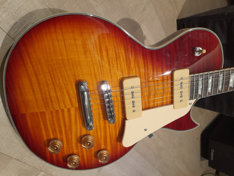 Inspiration Les Paul évidente mais corps plus mince donc plus légère, corne pointue et jonction corps/manche collée avec une découpe pour faciliter l'accès aux aigus. Quand même tout acajou et table en érable ondé superbe (pas épaisse mais c'est quand même de l'érable et non du film comme indiqué sur certains sites commerçants).
