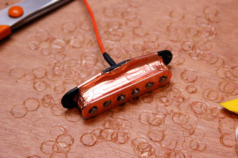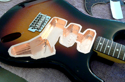 Le sélecteur est changé par un modèle plus robuste, c'était le but premier de l'intervention. Quelques connexion de masse superflues ont été supprimées (merci Gantok), les cavités micros et le pickguard revêtus de cuivre :
