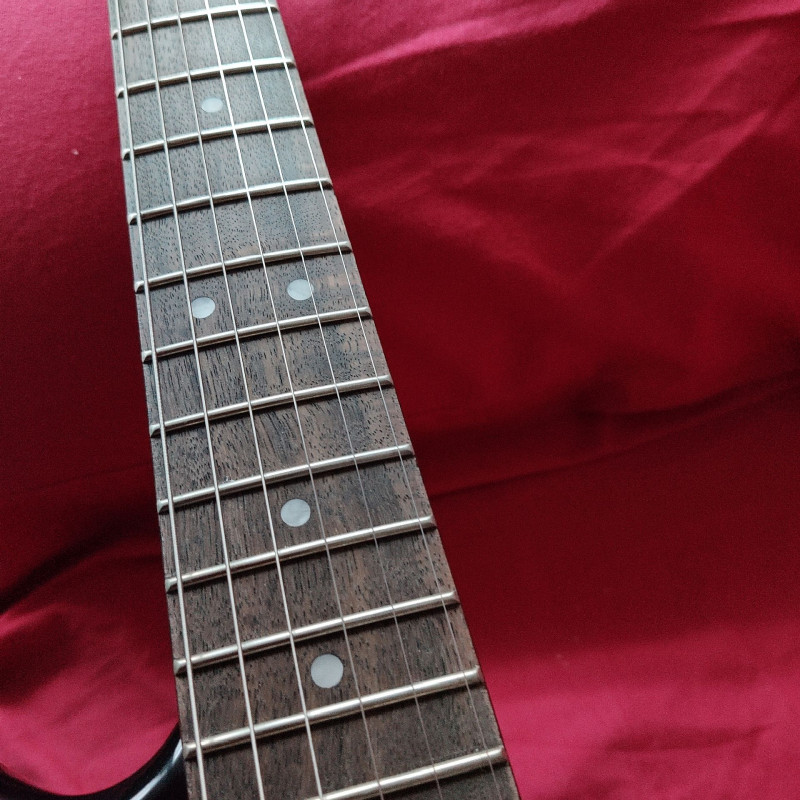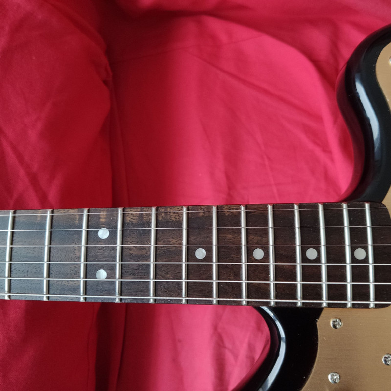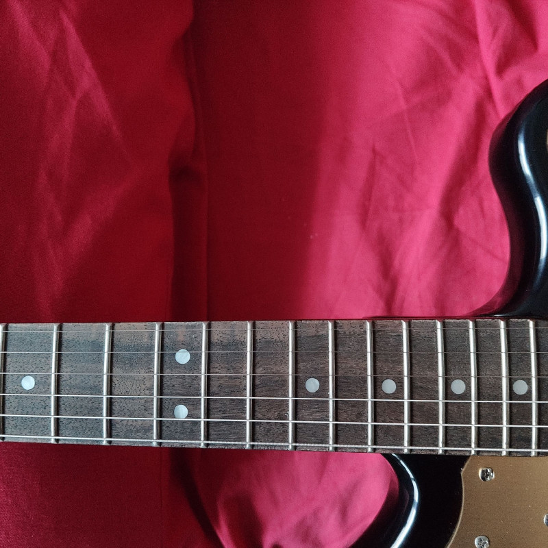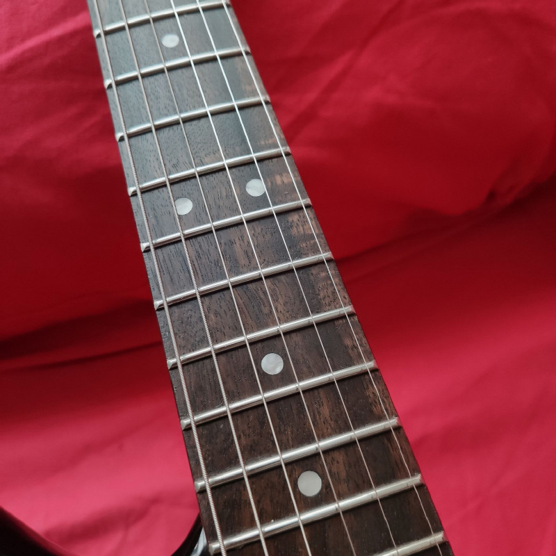Là j'ai failli la renvoyer illico, mais la sonorité à vide puis branchée m'a retenu: une sonorité avec du corps et très agréable et définie dans un Vox malgré les 9-42 de pacotille montées d'origine. Après tout, un nouveau challenge, c'et saussi ce que j'aime sur ces grattes.