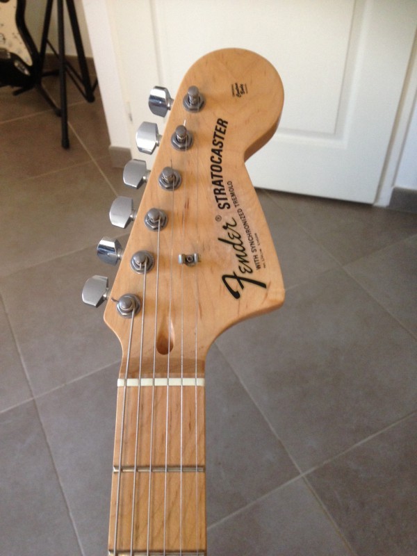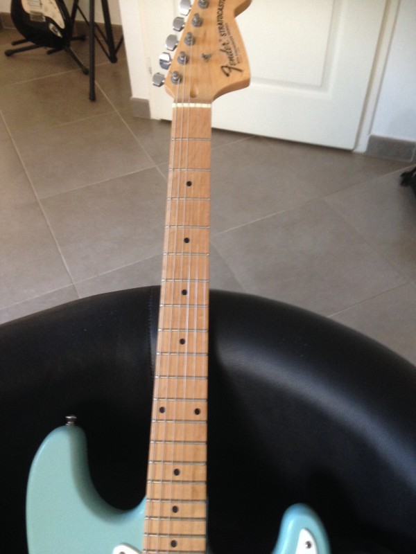 En revanche le manche est rapporté c'est sur. Tu devrais avoir un badge sur les mecas, le sigle fender à l'arrière c'est n'importe quoi et le bois à pas l'air top.