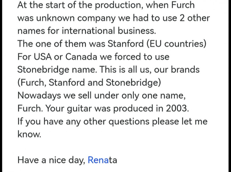 Nous confirmons ici qu'il n'y aucun lien entre les guitares Stanford et les Guitares Furch, et ceci depuis au moins 4 ans.