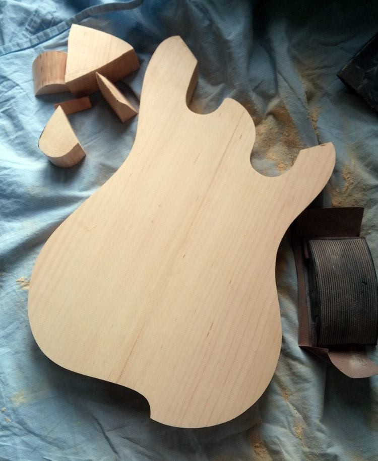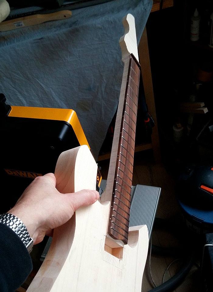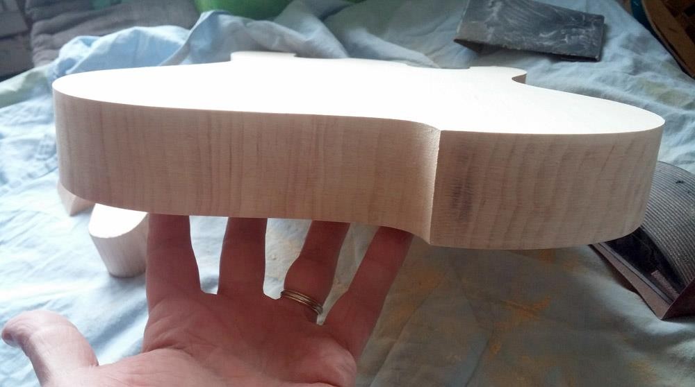 . Je souhaite garder l'épaisseur originale du manche, peut-être un tout petit peu plus fin et légèrement asymétrique (V côté pouce) pour faciliter la possibilité du pouce d'accéder à la 6ème corde par le haut. La couleur: Rouge et noir satiné en pur style Edgecaster, capos micros blancs de chez blanc, tête reverse.....