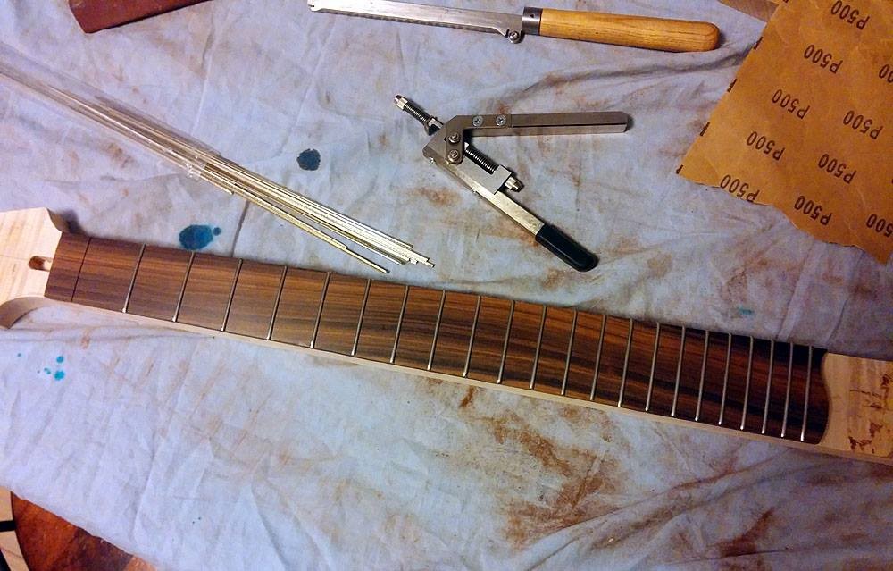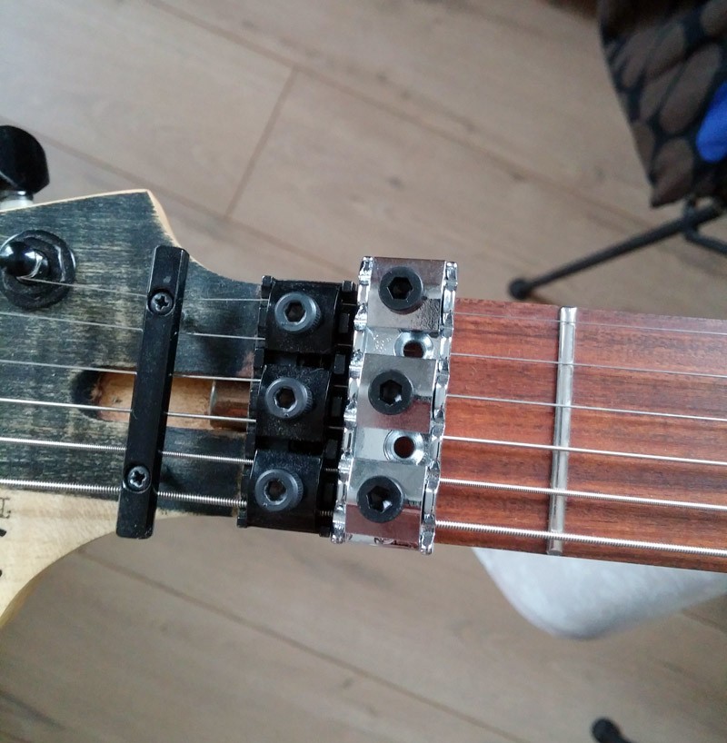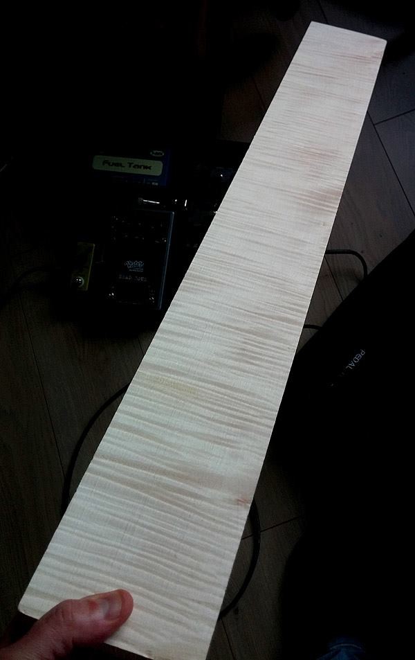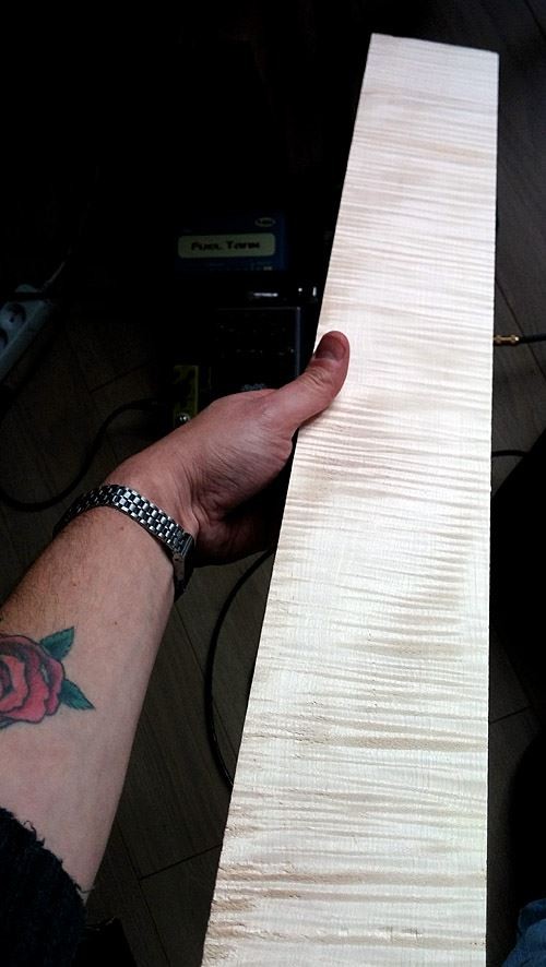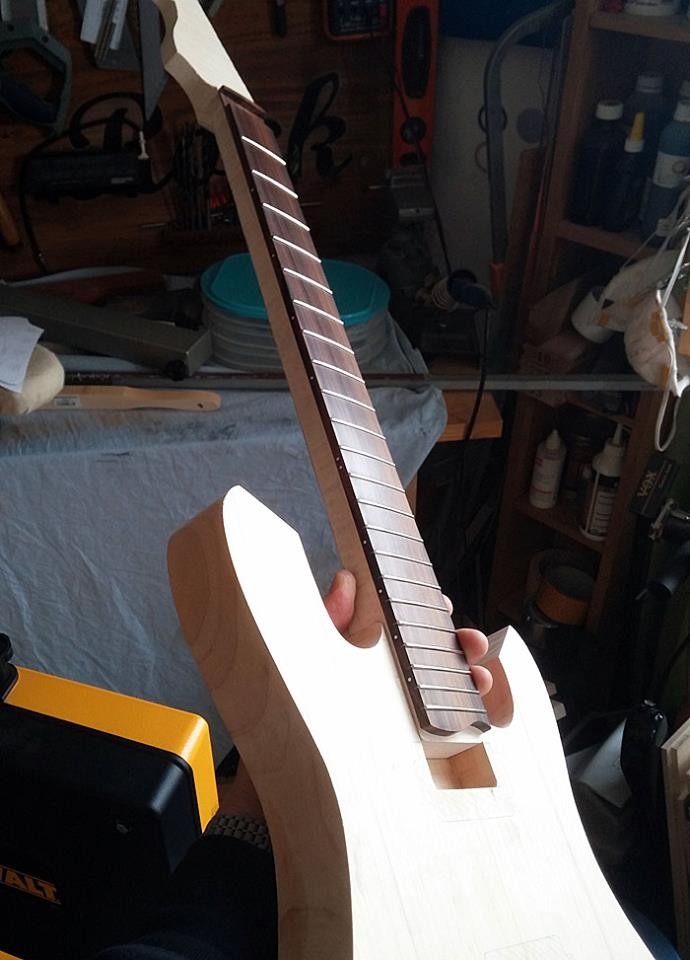 Donc voilà après de nombreuse discussions avec Steph on a une superstrat forme edgecaster, corps aulne, manche érable ondé touche Pau Ferro, Floyd Schaller chromé, mécas chromées, micros SP Custom Boom Leacher en position manche, Heat Crusher en position chevalet, 1 volume / 1 tone / selection 5 positions. Sillet FR R5 (45mm de largeur du manche au sillet (Merci George Lynch... :G3