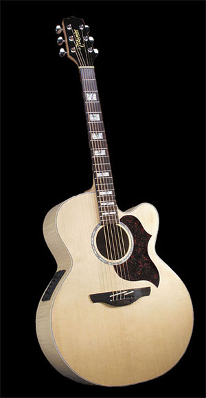 d'une part par son look , elle est vraiment tres belle , un peu dans le style des gibson J200 , la forme super jimbo est vraiment un regale pour ceux qui aiment , elle a vraiment un bonne projection , mais manque beaucoups de bass ( un comble pour une forme jumbo ) par contre en electro j'ai pas aimé ( a cause du systeme takamine qui colore le son de la guitare d'une facon que je n'aime pas