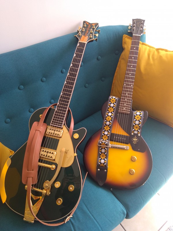 En ce qui me concerne, ce sont des sangles Jodi Head (comme sur la photo de la Strat page 3), faites main à NY... Je n'ai pris que des modèles en cuir (ne glissent pas sur l'épaule), recouverts de soie brodée motif 'dragon'. Elles sont très confortables, et je les trouve magnifiques