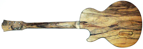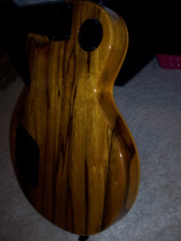 Par contre, c'est peut être une idée à faire remonter à Patrice, il y a un bois pas du tout rare, pas du tout cher et pas du tout protégé ni en voie de disparition qui est un excellent substitutif à l'acajou swietenia, Gibson ne s'est d'ailleurs pas privé d'en utiliser mais étrangement, le présente sous un nom qu'ils ont eux même créé comme étant un truc mojo hyper rare blabla, ce qui est du pur pipeau commercial, ce bois est le limba AKA fraké que Giby a rebaptisé 'korina'. Si le limba blanc ne paye pas de mine, le limba noir est à tomber à la renverse tant il est beau, de + le bois est poreux donc plutôt léger et super résonant, est réputé sonner quasi à tous les coups et quasi comme le swietenia, juste un poil plus brillant. Les toutes 1ères Flying V et Explorers qui atteignent des prix astronomiques en étaient fait et la dernière fois que Giby a fait une série de LPs avec ça, c'était 6k3€ chez Thomann (ce qui est du pur enculator de la planète Assek : ça revient - cher que de faire une LP en acajou!) et... ça ressemble à ça :