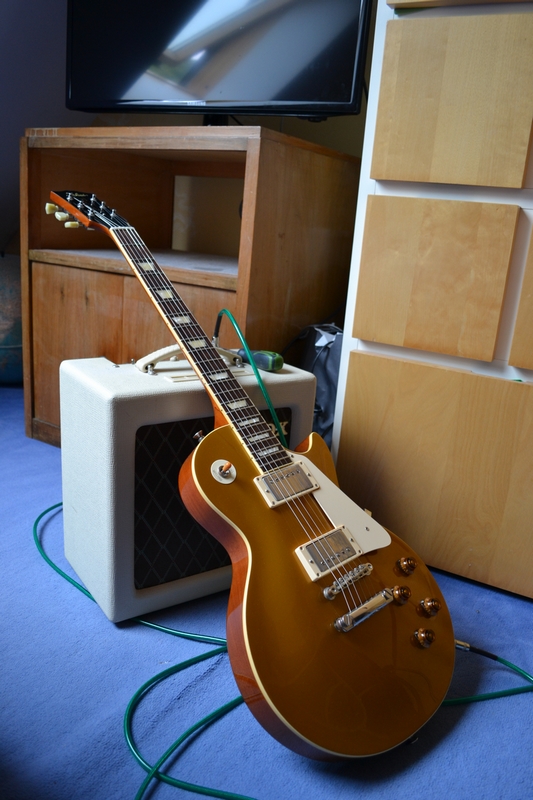 Place aux photos, dans mon petit coin guitare (qui n'est pas vraiment un coin), avec son vieux pote le Vox AC4TV qui lui n'avait pas traversé l'Atlantique.
