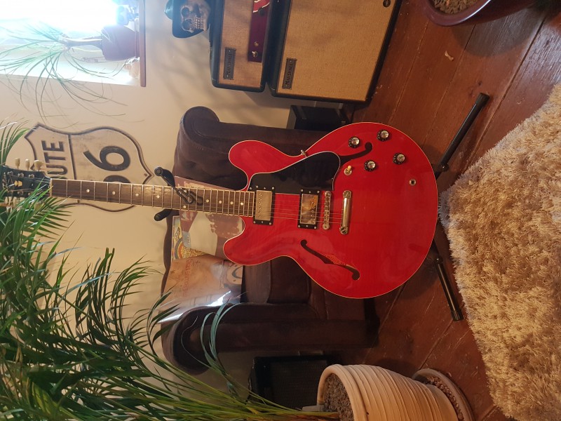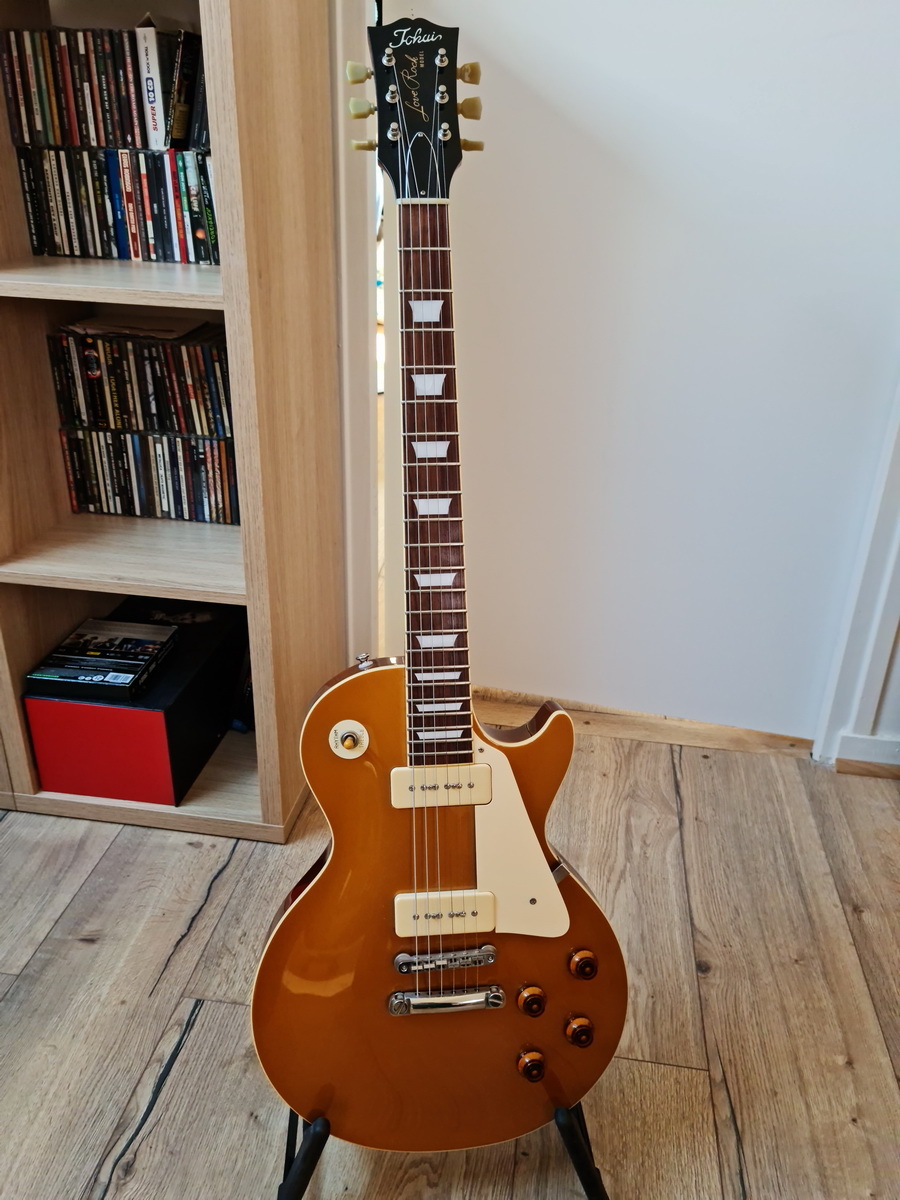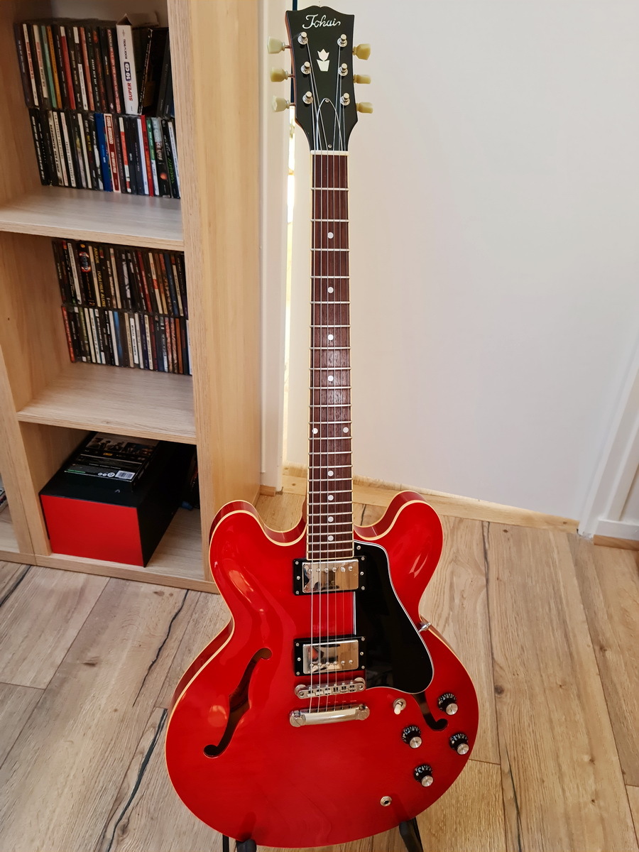 Dans la gamme Tokai ES made in Japan actuelle c'est le premier modèle, avec long pickguard et dot inlays. Rien à dire sur la qualité de fabrication : bindings, sillet, frets sont parfaits, réglage d'usine parfait aussi pour moi. Le manche, qui était mon principal point d'interrogation, me convient bien au final. Et je suis agréablement surpris par les humbuckers d'origine, même si j'ai déjà un upgrade en vue.
