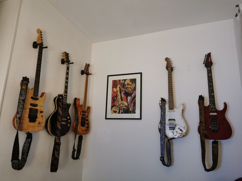 Cordes changées pour du ErnieBalls en 10-46, réglage du Floyd qui suit et franchement elle envoi grave !!! Micro simple Nickel pour les sons Hendrixiens, rythmiques Funk et plus généralement pour un bon son de strat et micro double pour les grosses rythmiques ou les solos