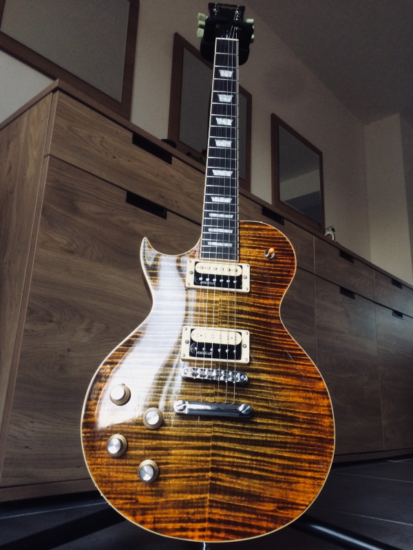 Allez, je déterre ce vieux topic pour vous présenter ma Vintage v100AFD Paradise (lefthanded) légèrement upgradée. La touche finale sera les micros Seymour Duncan APH-2S Alnico II Pro Zebra, l’année prochaine sûrement, après l’achat d’un Laney Lionheart L5T112...