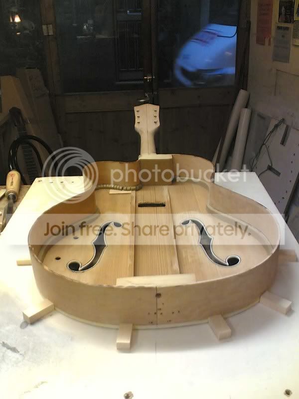 Si tu regardes le cylindre ou sont accrochées les cordes, généralement, il n'est pas perpendiculaire à l'axe de la guitare... La tension des cordes est un paramètre important et la symétrie pas forcément un gage de justesse t'as qu'a voir l'inclinaison du chevalet ! Même à l'époque il y avait des détails techniques très fins et un savoir-faire qui ont peut-être étés oubliés depuis