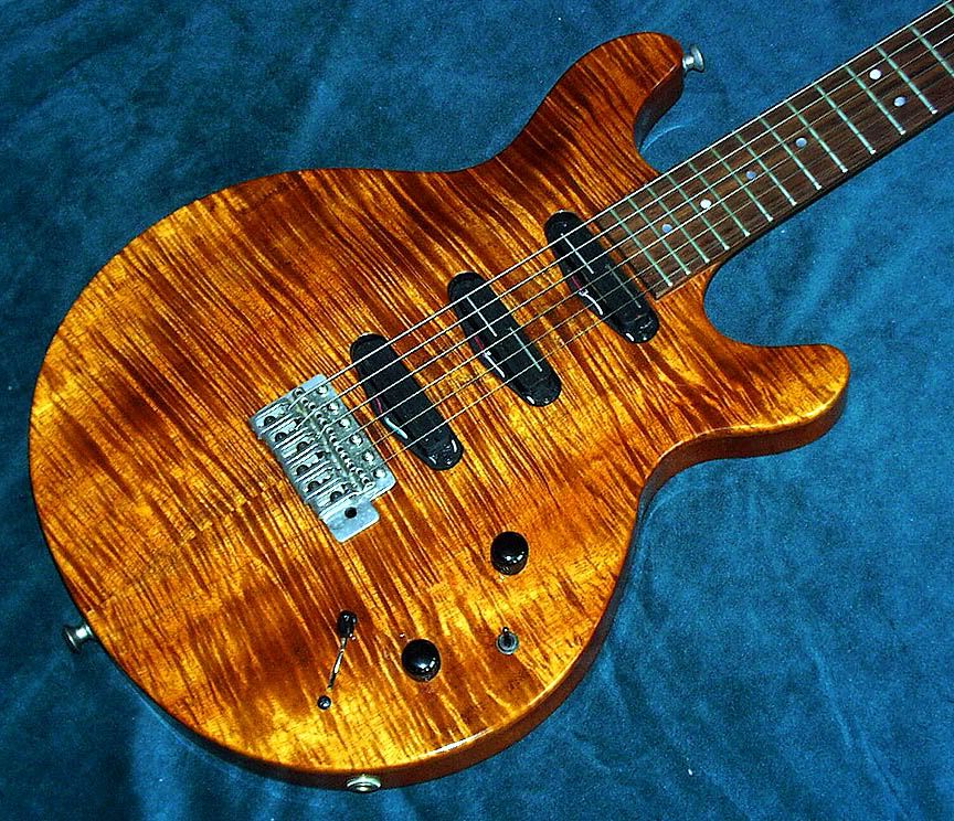 Hamer Mirage (pure US) sortie en 1994. Le choix des bois bien séchés était excellent (corps une pièce & manche en acajou du Honduras master grade, table en Koa à tomber, touche en palissandre indien AAA) ; ces bois liés à une lutherie d'exception (la table sculptée, le neck joint collé / profilé à la ressemblance d'un manche conducteur, par exemple) avec les 3 Seymour D (Hot rail–bridge, Vintage rails–middle et neck) font de la