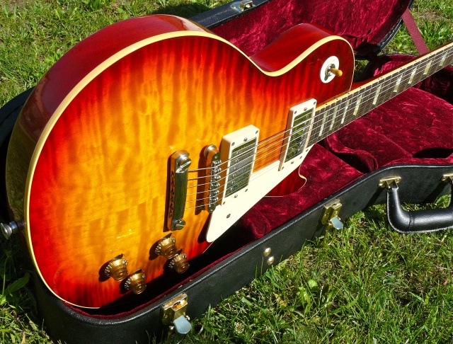Pour le son et le jeu, on rentre dans la sphère du subjectif et donc mon avis ne peut pas être généralisé à tous les guitaristes. Ma R9 est montée en 11-54, avec des micros Hepcat à très faible niveau de sortie, c'est donc une guitare avec une définition parfaite, assez cristalline pour une Les Paul et surtout dégageant pas mal de pêche ! En ce sens, elle ne pardonne pas les erreurs et peut s'avérer plus difficile à faire sonner qu'une guitare avec des micros plus puissants, des frets plus hautes et plus larges et un tirant de cordes plus faible. La Trad est quant à elle complètement d'origine (à part des mécaniques Grover) et montée en 10-46. Elle est donc plus facile à jouer et supporte mieux (du fait des micros plus puissants), les grosses saturations. En ce sens et parce qu'elle est plus "généraliste", certains pourraient la préférer à la R9. Surtout, la Trad est plus "stéréotypée" que la R9, elle ronfle plus, a des basses très (trop) présentes et une définition moindre, mais c'est une guitare fantastique. Si je peux me permettre une analogie automobile (si tu connais ce milieu, ça sera très clair), la Trad est une Porsche Carrera 4, facile, communicative, sécurisante et plaisante, la R9 est une GT3, plus abrupte, moins accessible, mais tellement plus gratifiante à l'approche de la limite ! Tu as deux 911, donc deux automobiles "similaires", mais à la philosophie très différente !