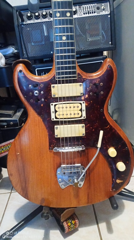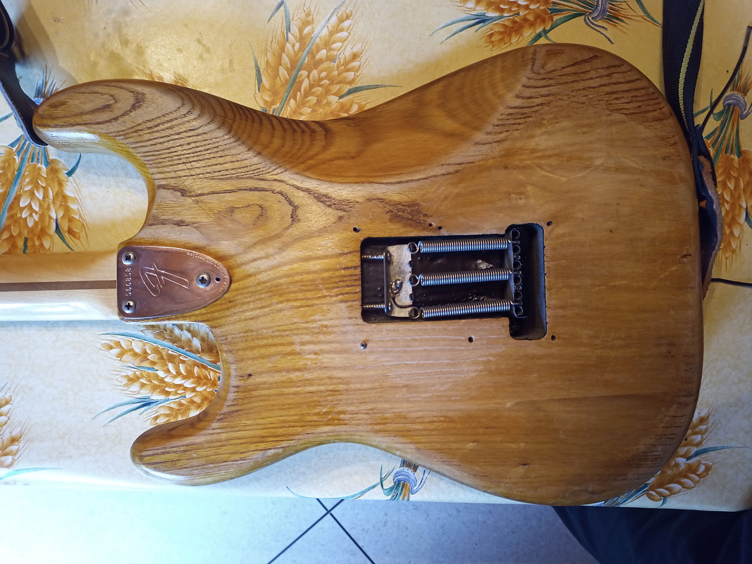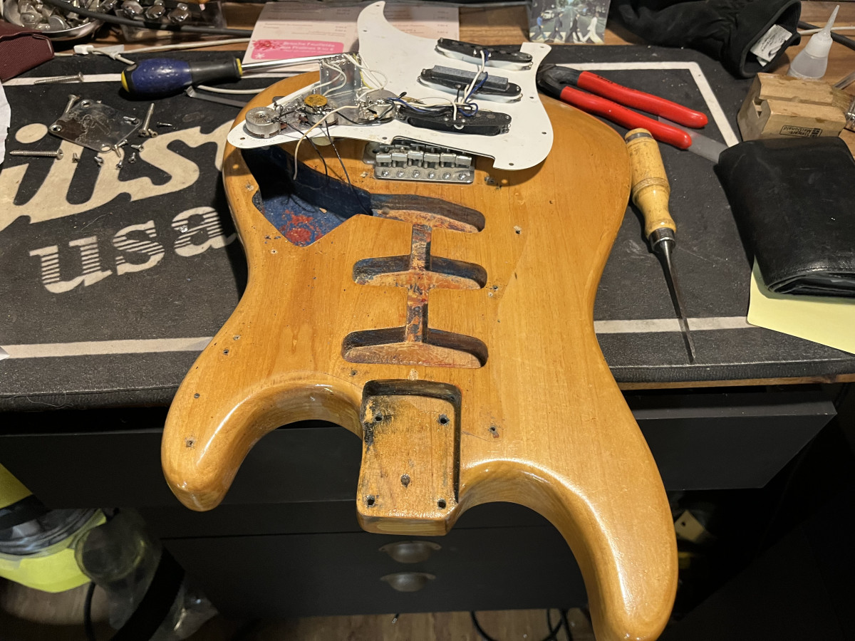 Au programme elle aura besoin au minimum d'un refrettage (je vais mettre de l'inox je pense), d'un câblage neuf de l'électronique, changer au moins 2 micros (seul le neck est d'origine donc pourquoi pas mettre deux Hepcat pour compléter) … bref, ça va piquer mais le jeu en vaut la chandelle.