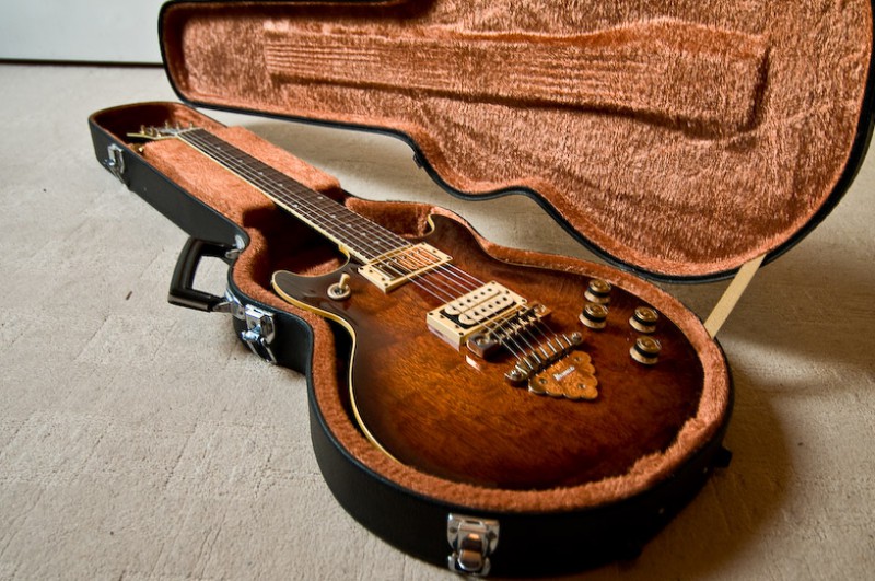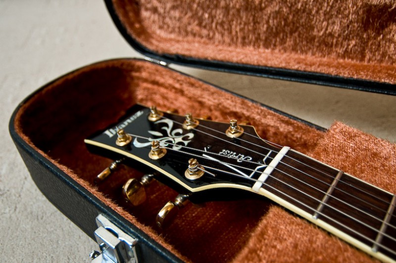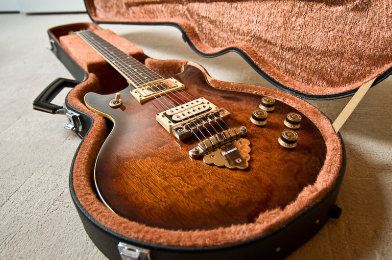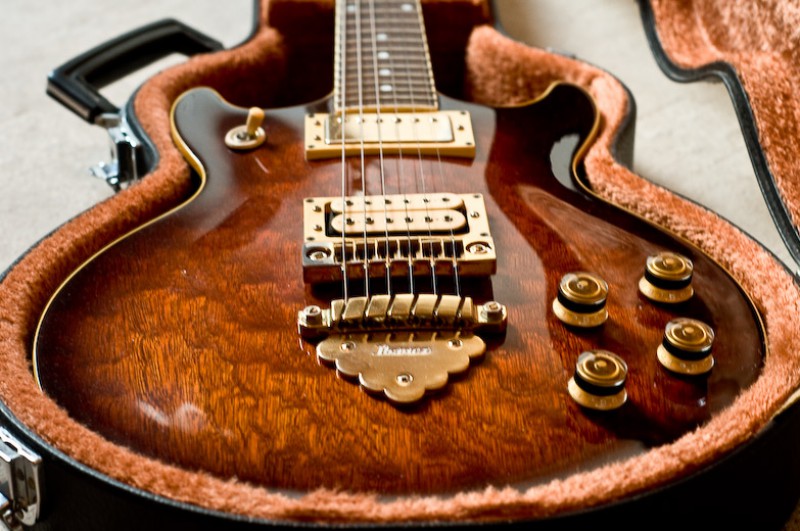 Une Ibanez AR105 Antique Violin d'août 1982, cette guitare se différencie du modèle AR100 par sa table en Mahogany Burl contrairement au maple pour la plus par des modèle Artist.