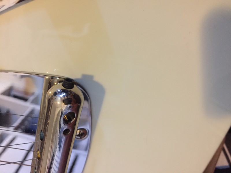 Ça ressemble à une vis pour maintenir la tige de vibrato, si tu ne t'en sers pas tu peux l'enlever.