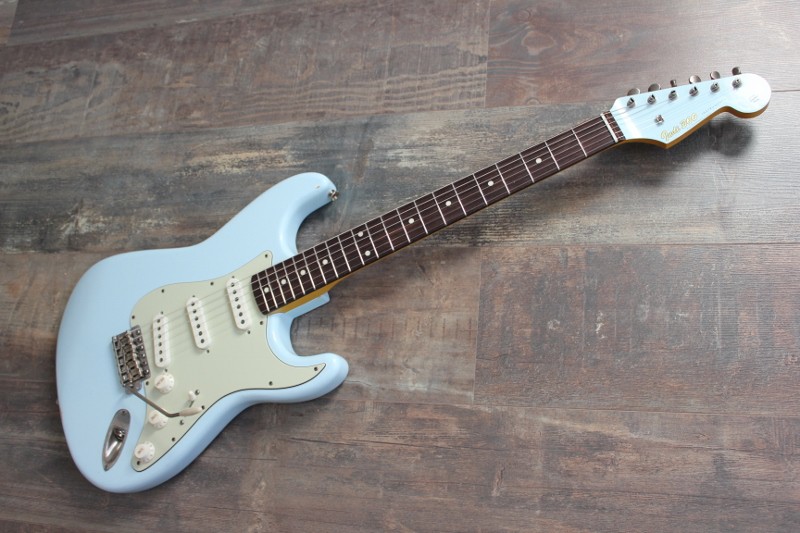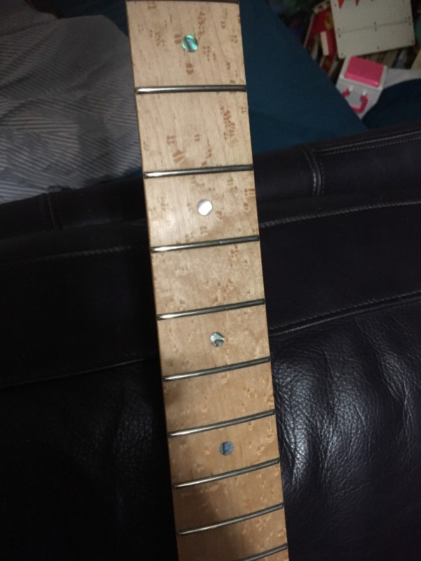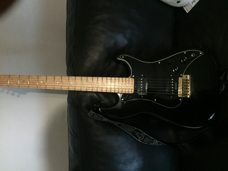 Le manche est un Fender birdeyes, j'ai fait en sorte de faire une mini blackie et comme pour mon malheur je n'ai trouvé qu'un vibrato doré US et bien j'ai pris le reste de l'accastillage en doré aussi... J'ai essayé de faire discret... Les boutons sont provisoires, j'attends de mettre des telecaster dorés...