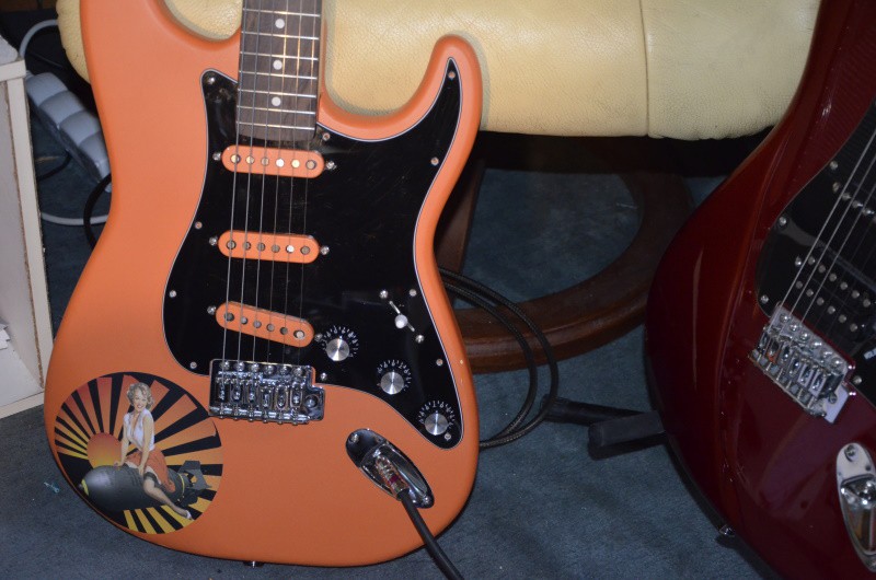 maintenant cela a cette touche la ?........euh ben la trouve que ça fait trop orange , je vais peut etre un peu calmer les choses avec un pickgard blanc et capot blanc . comme l avait fait FENDER puis SQUIER , orange et blanc .