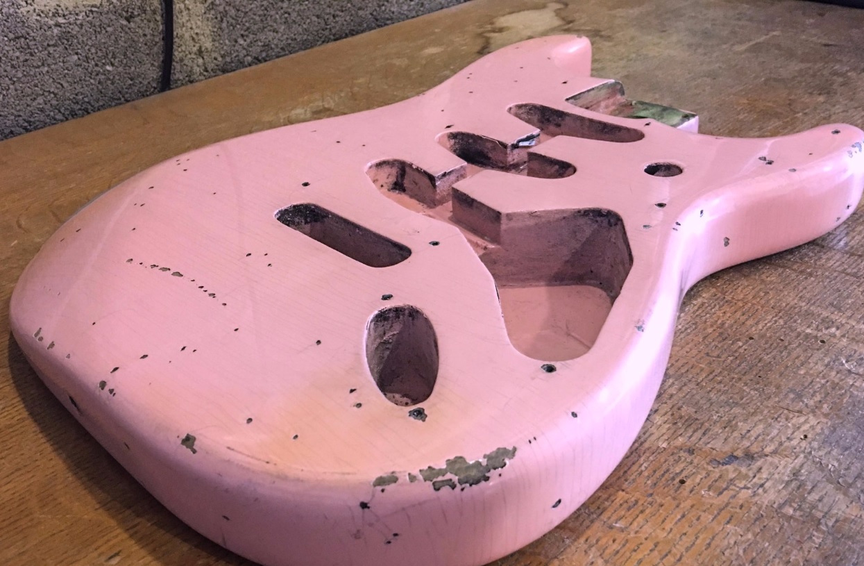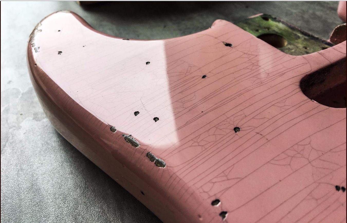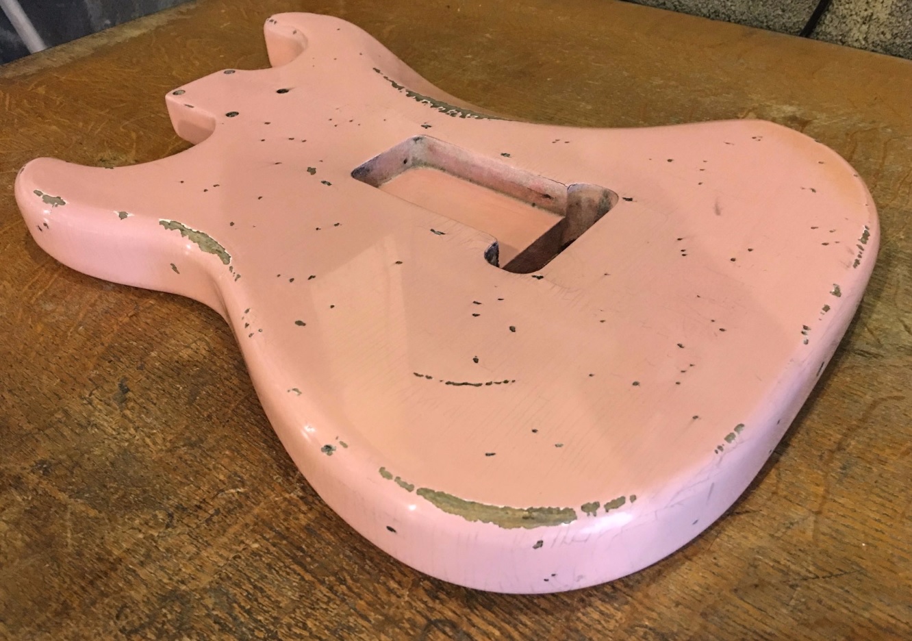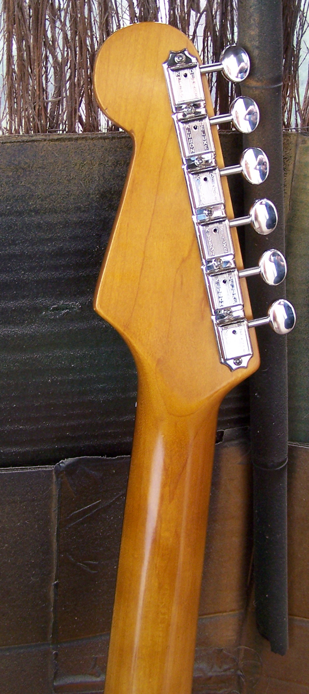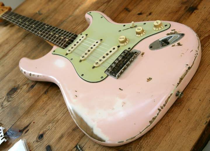 J'ai tout fait là-dessus..., du vernis "destroy" , au vieillissement des pièces plastiques et métalliques etc..., au choix de chaque pièces.(All parts pour la lutherie - Wilkinson (chevalet/mécas et Seymour-Duncan pour les micros - Glendale pour le chevalet/pontets compensé).
