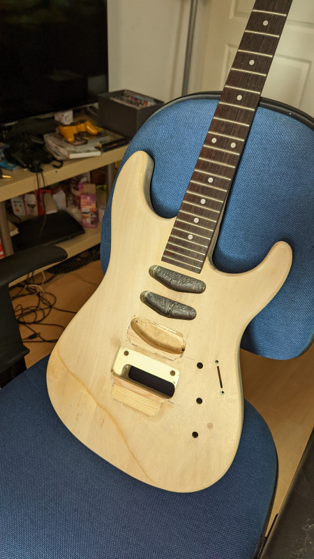 Au final comme les frettes commençaient à être pas mal usées et que c'était l'occasion d'avoir un gros manche, je me suis mis en tête de le remplacer par un boatneck Warmoth: frettes narrow tall, inox, 43mm au sillet.